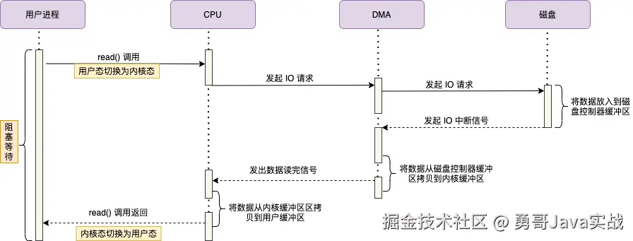 - 用户进程向 CPU 发起 read 系统调用读取数据,用户态切换为内核态,然后一直阻塞等待数据的返回。