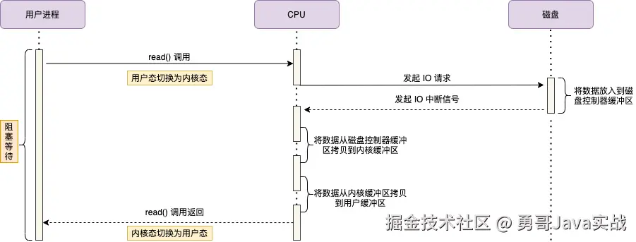 - 用户进程向 CPU 发起 read 系统调用读取数据,由用户态切换为内核态,然后一直阻塞等待数据的返回。