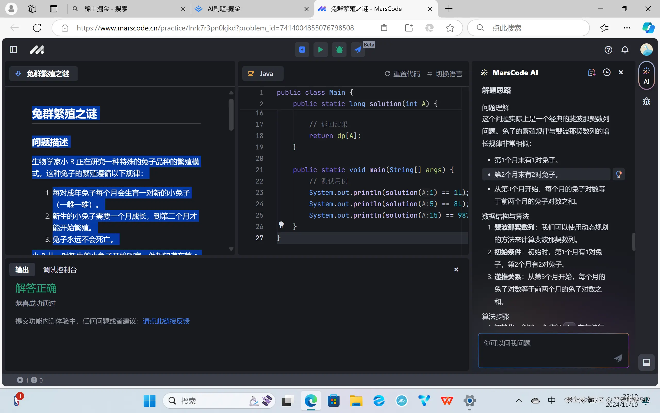 一、实践记录 1. 理解问题阶段 首先明确了这是一个关于兔子繁殖数量随时间(月份)变化的规律探索及计算问题。 仔细分析了兔子繁殖的三条规律,理解到新生兔子需一个月成长后才能繁殖,且成年兔子每月都会生育一对新兔子,同时兔子不会死亡。 对给出的测试样例进行了深入研究,通过样例 1 了解到初始 1 对新生兔子在第 1 个月末变成 1 对成年兔子的情况;样例 2 展示了经过几个月后兔子对数按照规律增长到第 5 个月末为 8 对的过程;样例 3 则给出了较远期(第 15 个月末)的兔子对数情况,有助于感受随着月份增加兔子数量增长的趋势。 2. 算法设计阶段 发现可以使用斐波那契数列的思路来解决此问题。因为从第三个月开始,每个月的兔子总数等于前两个月兔子总数之和。即第 n 个月的兔子对数是第 (n - 1) 个月的兔子对数(原有兔子继续存活且成年兔子继续繁殖)加上第 (n - 2) 个月的兔子对数(第 (n - 2) 个月的成年兔子在第 n 个月又繁殖出的新兔子对数)。 确定了基本的计算步骤:先处理月份为 1 和 2 的特殊情况,直接返回对应的兔子对数 1 和 2;对于月份大于 2 的情况,通过循环依次计算每个月的兔子对数,利用两个变量来保存前两个月的兔子对数并不断更新,直到计算出指定月份的兔子对数。 3. 代码实现阶段 Python 实现: 定义了函数 rabbit_population,函数接收一个整数参数 A 表示月份数。 在函数内部,首先通过条件判断 if A == 1 和 if A == 2 来处理特殊情况,分别返回 1 和 2。 对于 A > 2 的情况,使用 a, b = 1, 2 初始化前两个月的兔子对数,然后通过 for 循环从第 3 个月开始计算,在循环中 c = a + b 计算当前月的兔子对数,接着更新 a 和 b 的值为前一个月和当前月的兔子对数,循环结束后返回 b,即指定月份 A 的兔子总对数。 Java 实现: 创建了 RabbitPopulation 类,在类中定义了静态方法 rabbitPopulation,接收一个整数参数 A。 同样先通过 if 语句处理 A 为 1 和 2 的情况,返回相应的兔子对数。 对于 A > 2 的情况,使用 long 类型的变量 a 和 b 初始化前两个月的兔子对数,通过 for 循环按照斐波那契数列的计算方式更新变量的值,最后返回指定月份 A 时的兔子总对数 b。 C++ 实现: 定义了函数 rabbitPopulation,函数接受一个整数参数 A。 先处理 A 为 1 和 2 的特殊情况,返回对应的兔子对数。 对于 A > 2 的情况,使用 long long 类型的变量 a 和 b 初始化前两个月的兔子对数,在 for 循环中按照规律计算并更新变量的值,最终返回指定月份 A 的兔子总对数 b。 4. 测试阶段 将测试样例中的月份值依次代入编写好的程序中进行测试。 对于样例 1,输入 A = 1,程序正确返回 1,验证了初始情况和第一个月的计算正确。 对于样例 2,输入 A = 5,程序返回 8,与预期结果相符,说明程序在计算前几个月的兔子对数增长情况是正确的。 对于样例 3,输入 A = 15,程序返回 987,再次验证了程序在计算较远期月份时兔子对数的准确性。 还可以尝试输入其他不同的月份值进行测试,进一步确保程序在整个规定的月份范围(1 ≤ A ≤ 50)内都能准确计算出兔子的总对数。 二、工具使用 1. 文本编辑器 在编写代码过程中,使用了常见的文本编辑器,如: Visual Studio Code:它是一款非常流行的开源文本编辑器,具有丰富的插件生态系统。可以通过安装相关的编程语言插件(如 Python 插件、Java 插件、C++ 插件等)来提供代码自动补全、语法高亮、代码格式化等功能,方便代码的编写和阅读。在编写上述三种语言的代码时,都可以利用它来快速输入代码并进行初步的编辑和调整。 Notepad++:也是一款常用的文本编辑器,支持多种编程语言的语法高亮等基本功能。它相对比较轻量级,启动速度快,对于简单的代码编写和修改也很方便。在编写代码时,可以用它来快速记录思路、编写代码片段,然后再将代码转移到更专业的开发环境中进行进一步完善(如果需要的话)。 2. 编译器或解释器 Python:使用了 Python 的官方解释器。通常在安装好 Python 环境后,可以在命令行终端中直接输入 python(具体命令可能因操作系统和安装方式略有不同)进入 Python 解释器环境,然后将编写好的 Python 代码逐行输入进行测试,或者将整个 Python 代码文件保存后,在命令行中通过 python [文件名].py 的方式运行代码进行测试。 Java:需要先安装 JDK(Java Development Kit),安装完成后,通过命令行使用 javac 命令编译 Java 源文件(如 javac RabbitPopulation.java)生成字节码文件,然后再使用 java 命令运行字节码文件(如 java RabbitPopulation)来测试程序。也可以使用集成开发环境(IDE)如 Eclipse 或 Intellij IDEA,这些 IDE 内部集成了编译器和运行环境,可以更方便地进行代码的编写、编译和运行,同时还提供了代码调试等功能。 C++:同样需要先安装 C++ 的编译器,如 GCC(GNU Compiler Collection)。在命令行中,可以使用 g++ 命令编译 C++ 源文件(如 g++ rabbitPopulation.cpp -o rabbitPopulation),其中 -o 选项用于指定生成的可执行文件的名称,编译完成后通过运行生成的可执行文件(如 ./rabbitPopulation)来测试程序。类似地,也可以使用 IDE 如 Code::Blocks 或 Visual C++ 等进行代码的编写、编译和运行,这些 IDE 也提供了更多的便利功能如代码调试等。 3. 调试工具(可选) 如果在测试过程中发现程序运行结果不正确,可以使用调试工具来查找问题所在。 Python:可以使用 pdb 模块进行调试。在代码中插入 import pdb; pdb.set_trace() 语句,当程序运行到该语句时,