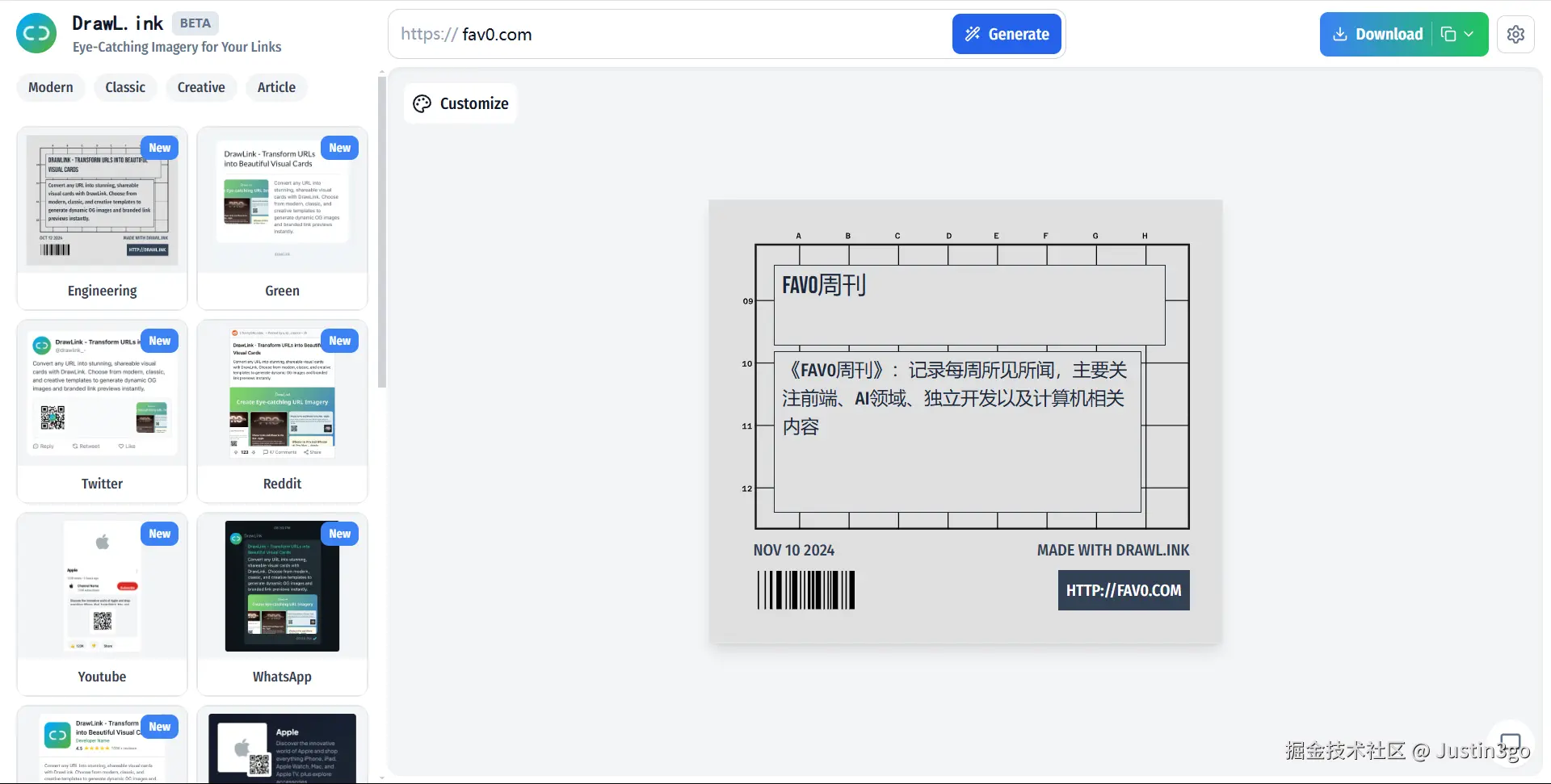 提取链接中网站的一些元信息,然后放入到模板之中,目前模板还不算多,有14种,不过可以自定义。