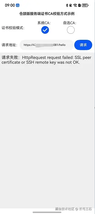 可以看到,请求是失败的,因为服务器使用的是自签名证书,而系统CA证书校验模式下,使用系统自带的CA证书对服务器证书进行校验,所以请求失败。