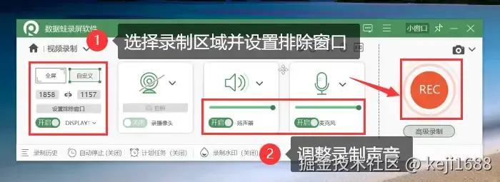 步骤3:以 【视频录制】 模式为演示,我们在进行录制前可以自由选择录制的区域范围并设置排除窗口,调整录制声音后可点击 【REC】 录制按钮进行录制,也可以使用快捷键 【Alt+S】 进行快速录屏。