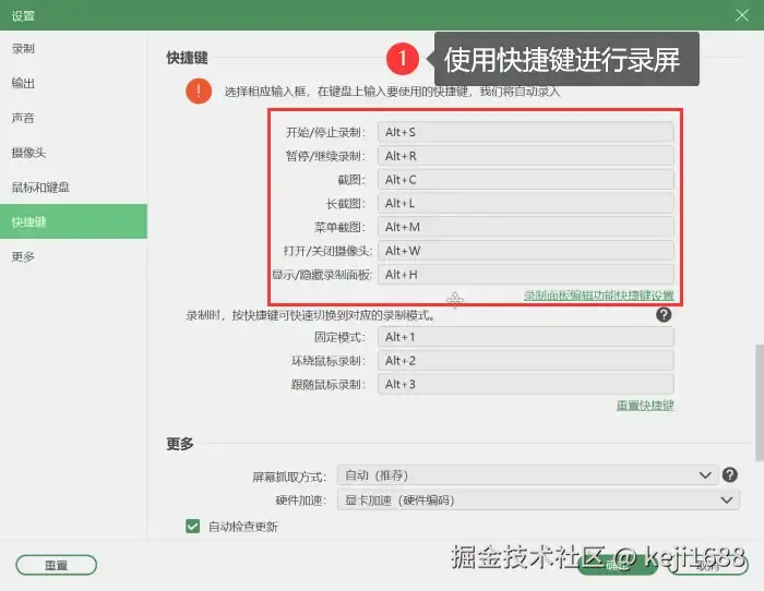 步骤2:在主页面的右上方可以进入软件设置页面,我们可以预览所有的快捷键,通过快捷键快速开启录屏,还可以根据需求和习惯自定义录屏快捷键。