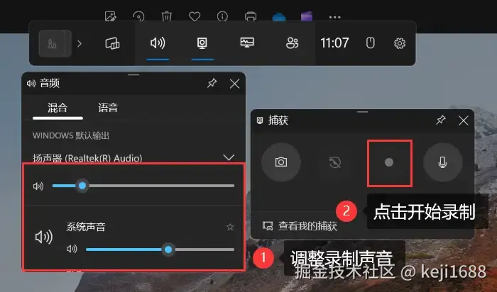 步骤2:可以先调整好录制的声音,点击 【圆形】 录屏按钮,或使用 【Win+Alt+R】 快捷键开始录屏。