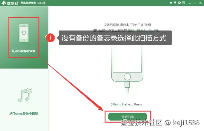 步骤1:在电脑上启动苹果恢复专家,将手机通过USB数据线连接电脑后,选择合适的扫描方式进行扫描。