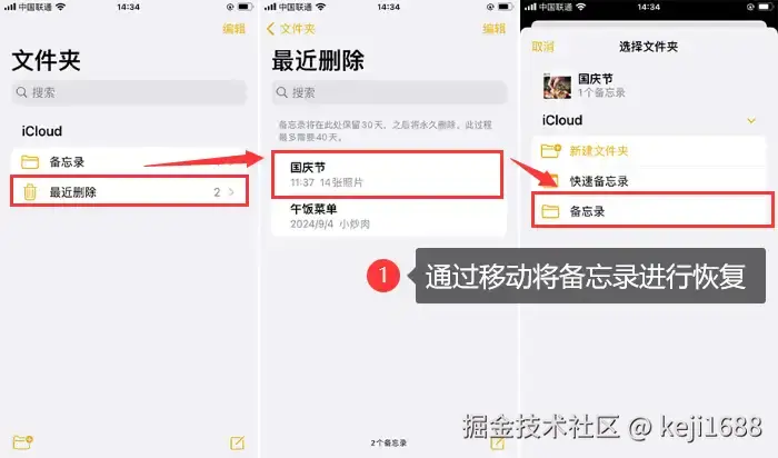 具体操作:打开备忘录应用,向下滑动至屏幕底部,找到并点击【最近删除】选项。在列表中,你可以看到最近30天内删除的备忘录(最多40天),选择需要恢复的备忘录,将其移动到原有的【备忘录】应用中即可。
