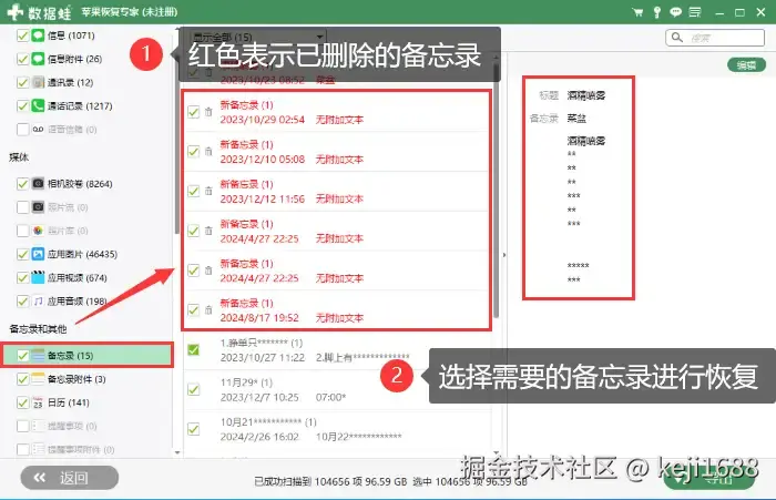 步骤2:在扫描的结果中点击选择 【备忘录】 内容,红色的内容就表示已经删除但软件可以恢复的备忘录,选择您需要的备忘录轻轻一点就能进行恢复了。