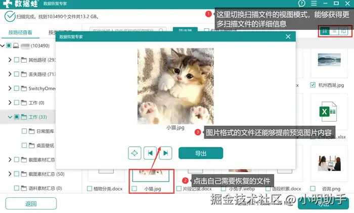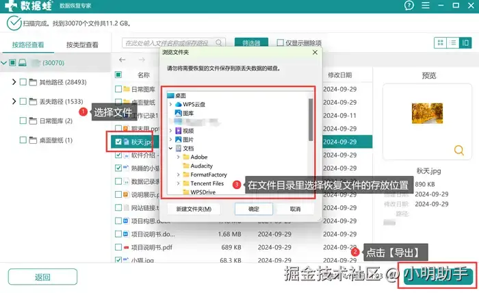 步骤3: 选中自己需要恢复的文件后,点击右下角的【导出】,最后在弹窗选择恢复文件的存储位置。