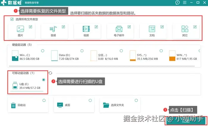 步骤1: 在U盘连接好电脑后,打开数据 蛙恢复专家的首页,在上面勾选好需要恢复的数据类型和U盘,最后才点击【扫描】。