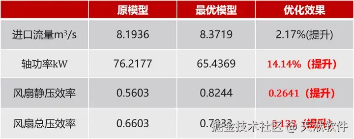风扇的轴功率降低14.14%,大于10% 的目标。同时进口流量、静压和总压效率也都有小幅提升,意外之喜。