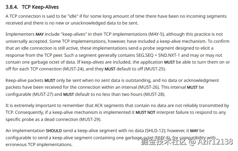 简单来说,TCP中的keep-alive是一种由操作系统实现的连接检测机制,但该机制检测出来的异常连接并非一定准确,在TCP文档中着重介绍了这一点。