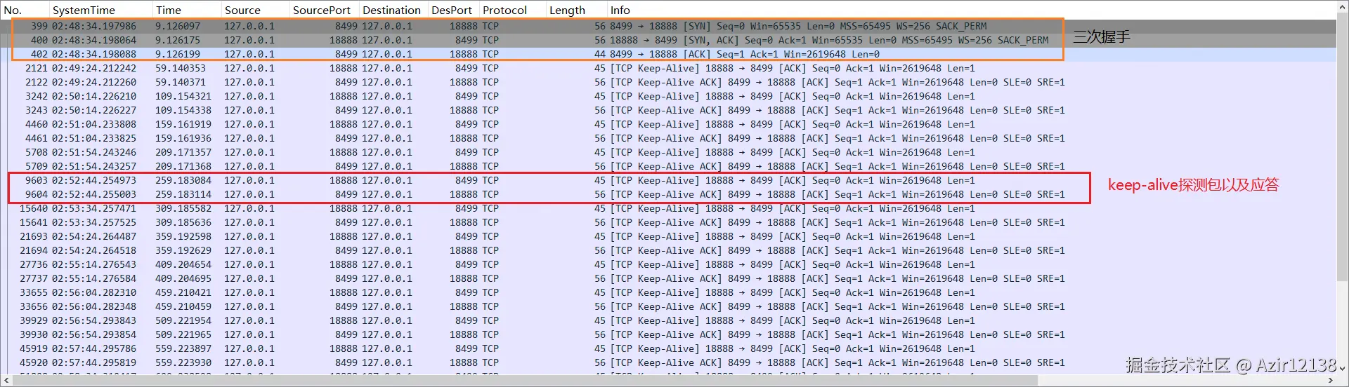 使用Wireshark进行抓包后,可以看到在TCP连接后的50秒后,发送了keep-alive的探测包,并且每隔50秒都会进行发送。