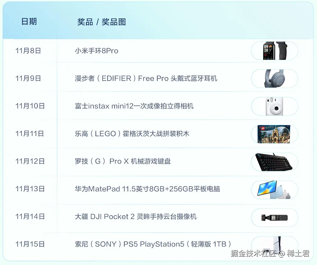 我们也准备了丰富的直播间分享活动,不管你是在校生、还是已经工作的开发者,都可以参与活动赢得大奖!快来跟着稀土君一起看看吧!