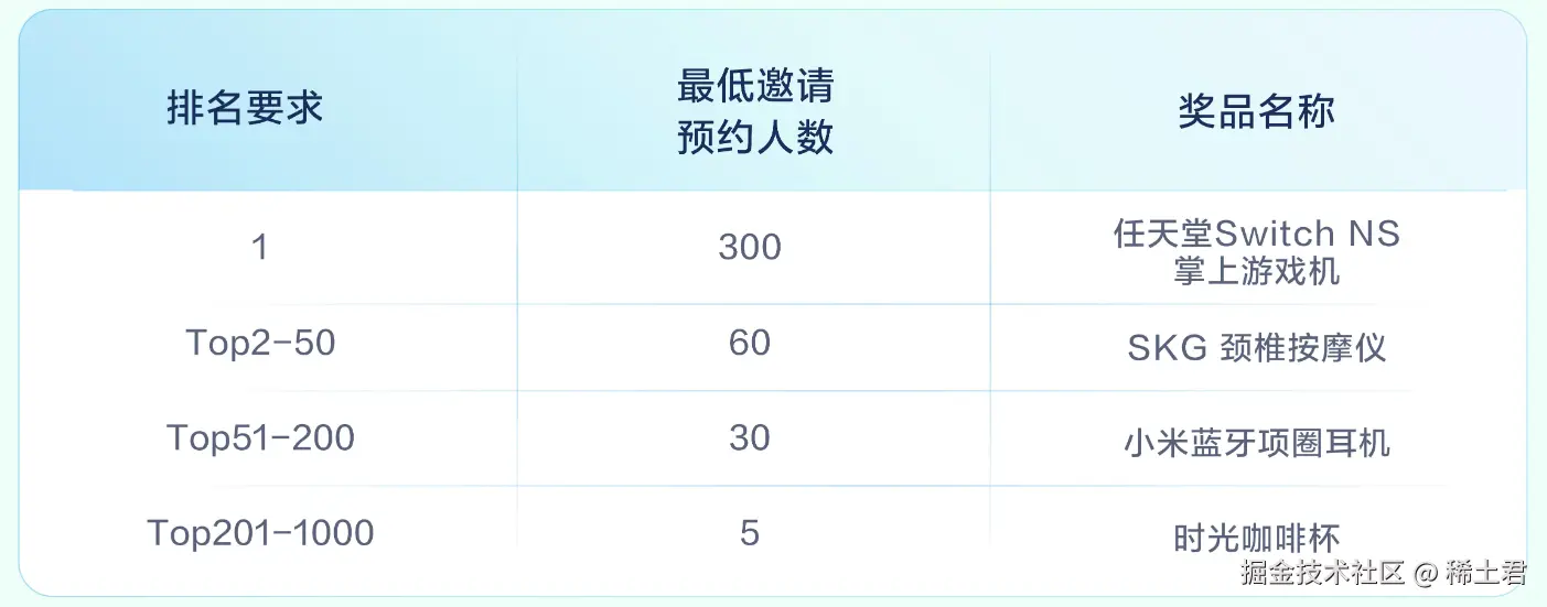 奖励规则:在满足最低邀请人数条件的基础上,按照排名发放对应奖品,不重复获奖。刷量等作弊行为将取消获奖资格。