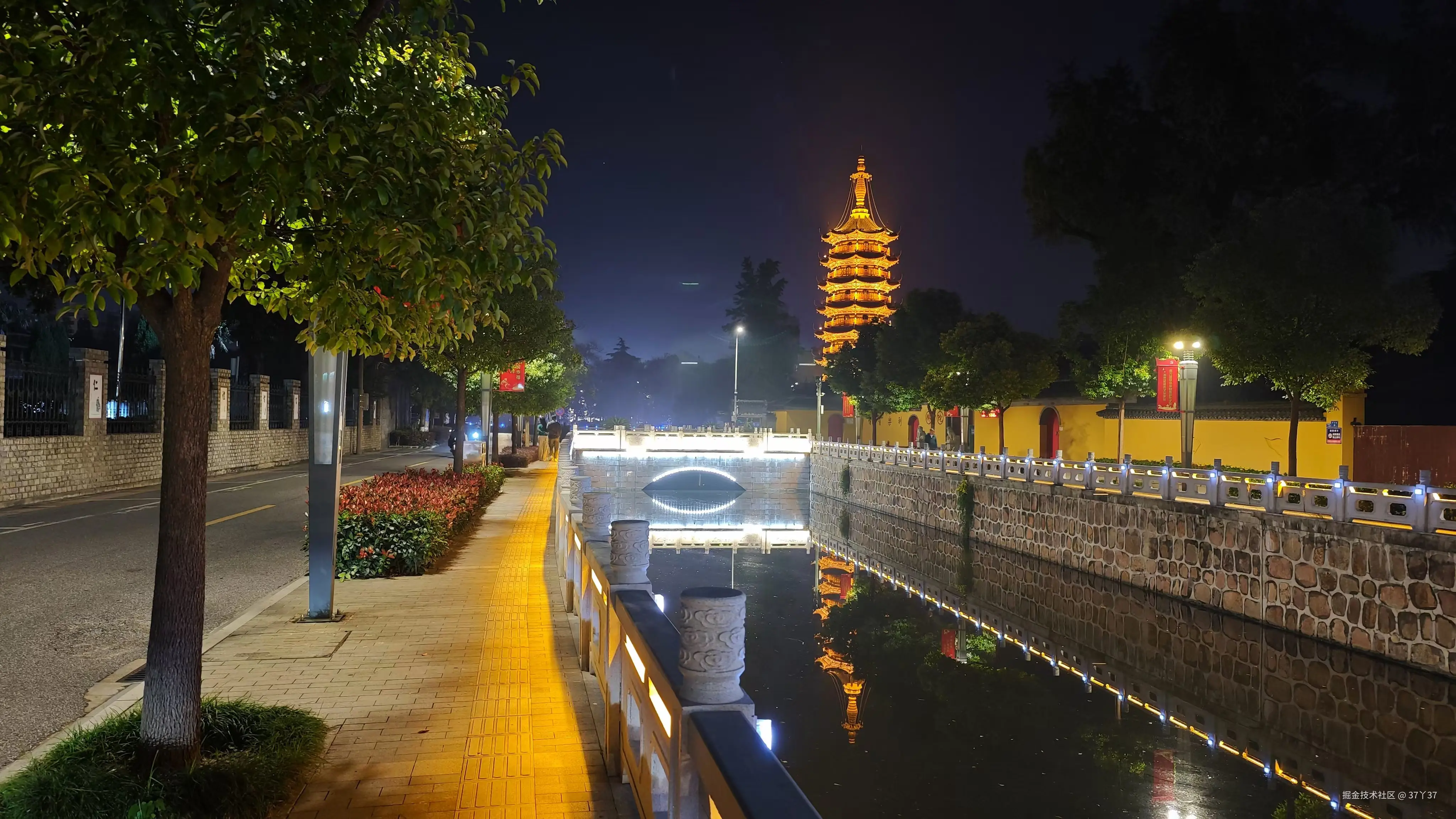 填饱肚子,city-walk,散散步消消食,夜晚的古城被装饰的很漂亮,今天的路线基本都在如皋古城内,如皋古城分内城和外城,外圆内方,形似古钱。围绕内城有一条内城河,大治路出来沿内城河一直走到了定慧禅寺,晚上的定慧禅寺古朴庄严,寺内的观音塔在灯光的掩映下金碧辉煌,走近观音塔看其倒映在内城河内,形成了双塔一实一虚的绝妙景观,很好看