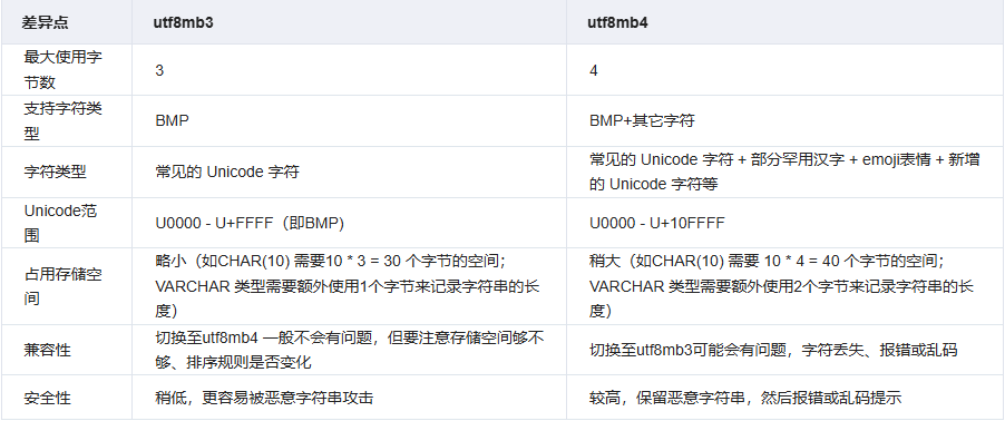 utf8mb4:mb4即 most bytes 4,即最多使用4个字节来表示完整的UTF-8,具有以下特征: