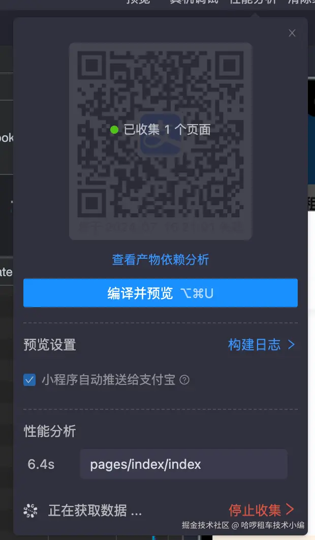 性能分析:支付宝IDE自带的性能分析工具,类似于真机调试,打码扫码后打开小程序,根据用户操作会记录各个页面性能数据。