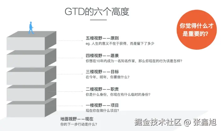 在GTD中称为六个视野(四楼、五楼是我本人的愿景和原则)。