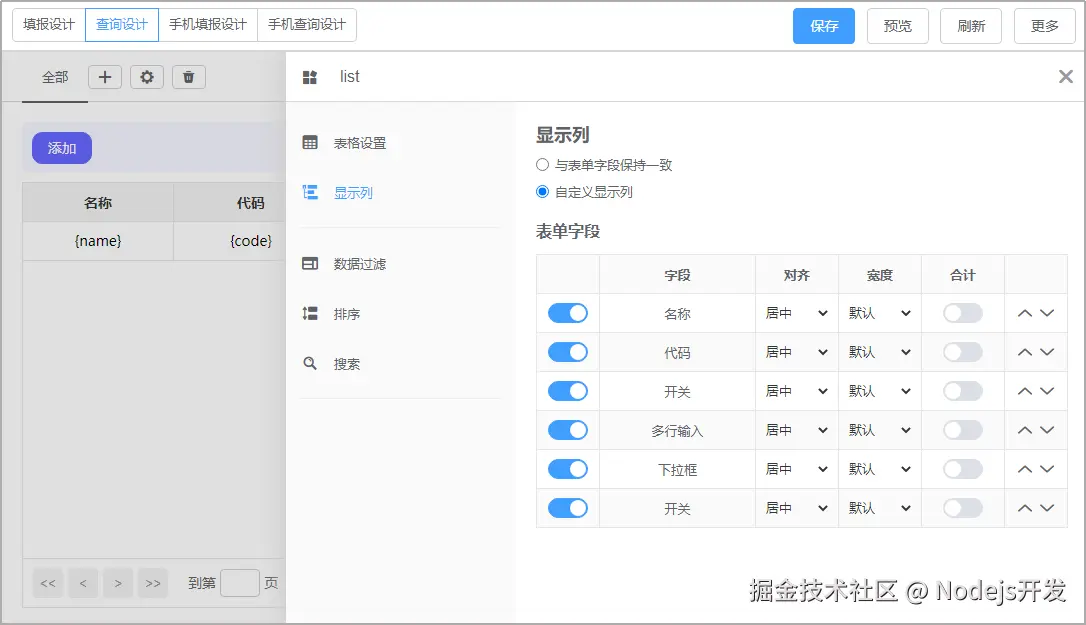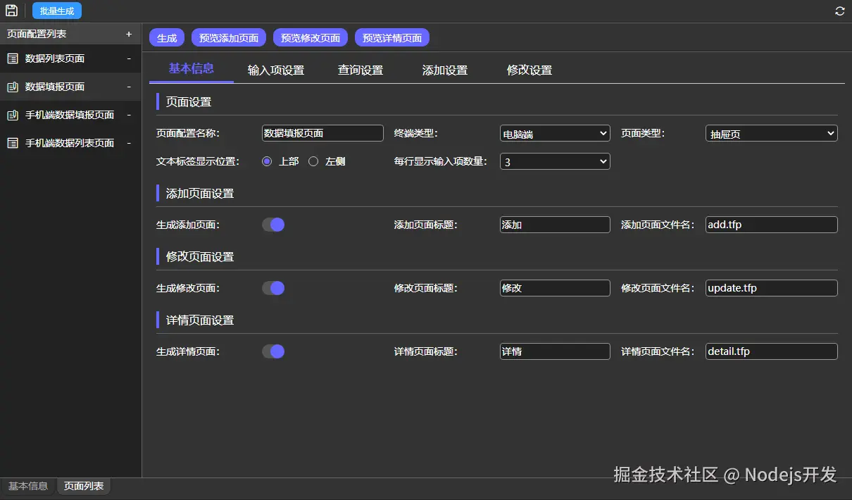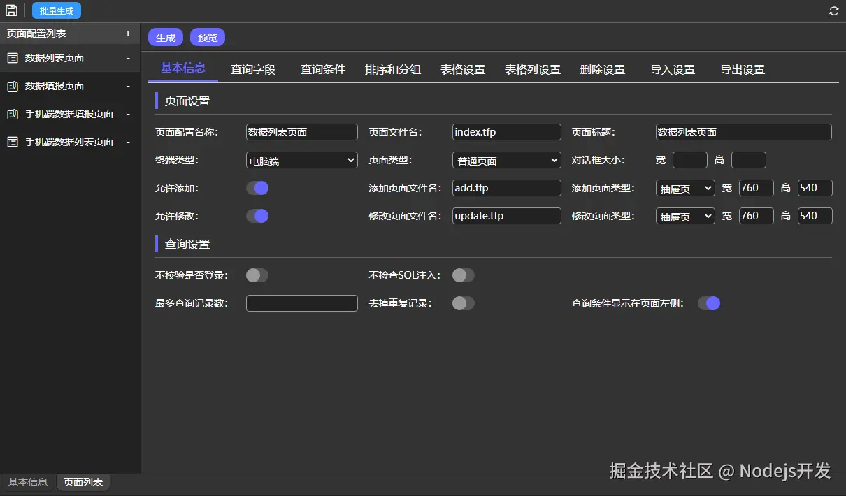 “生成式应用”,它的操作难度介于上面的两种模式之间,比低代码简单,比零代码复杂;功能比零代码强大,比低代码弱一些。适合用零代码实现不了、但用低代码又觉得操作麻烦的场景。这种模式以应用配置信息为核心,可以给一个应用配置多种类型的页面,包括列表页面、填报和查看页面等,每种类型的页面都可以配置多个。列表页里可以配置查询条件、要查询的字段、列表里显示的列及详细参数、排序条件、分组条件、可以进行哪些操作等,填报页面可以配置要显示的字段及其输入项。对这些页面的配置类似使用前端页面创建向导创建页面时所做的设置一样,区别是向导只能一次性使用,创建完页面后就没法再使用向导里的那些功能来配置页面,而基于配置信息的开发模块可以随时修改配置,改完点击生成就能生成最新的前后端代码。这种开发模式依然需要先创建数据模型,或者使用现有的数据模型,但不需要设计前端页面和后台服务,而是根据配置信息自动生成。
