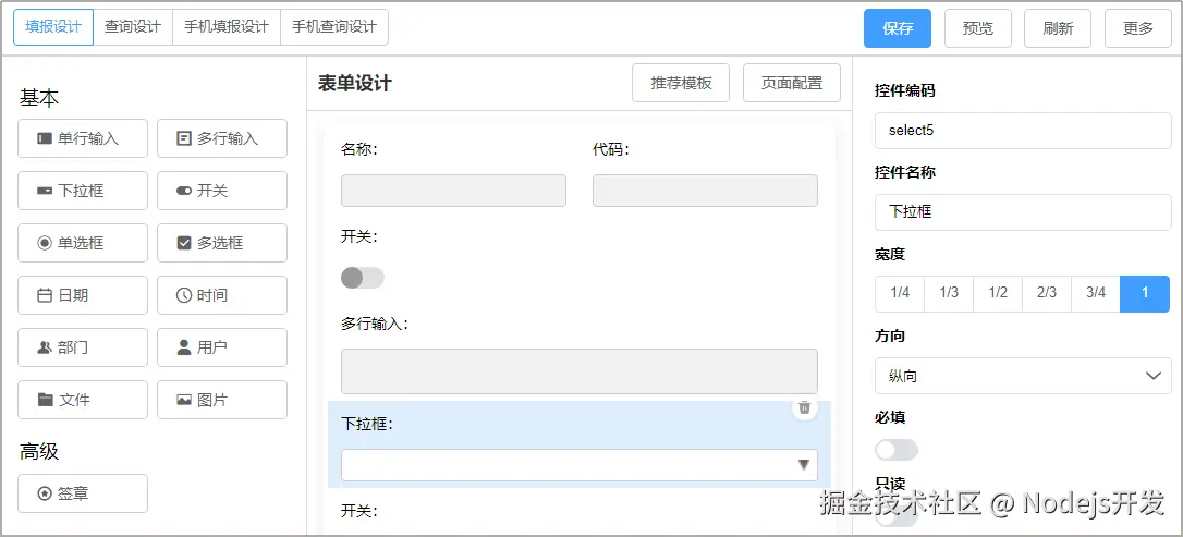 在TaskBuilder内,最简单的开发模式就是基于数据表单的零代码开发模式,这种模式将数据模型、后台服务和前端页面这三种元素统一合并到一个叫“数据表单”的文件里,只需要在这一个文件中配置填报和查询界面,就会自动生成对应的数据模型、后台服务和前端页面,而且界面设置非常简单易用,不需要任何编程基础,直接就可以上手操作。但相应地,该模式为了尽量简化操作,不支持配置复杂的前后端业务逻辑,也不支持自定义组件样式,所以,这种开发模式只适合开发一些简单的应用,不支持开发特别复杂的业务系统。