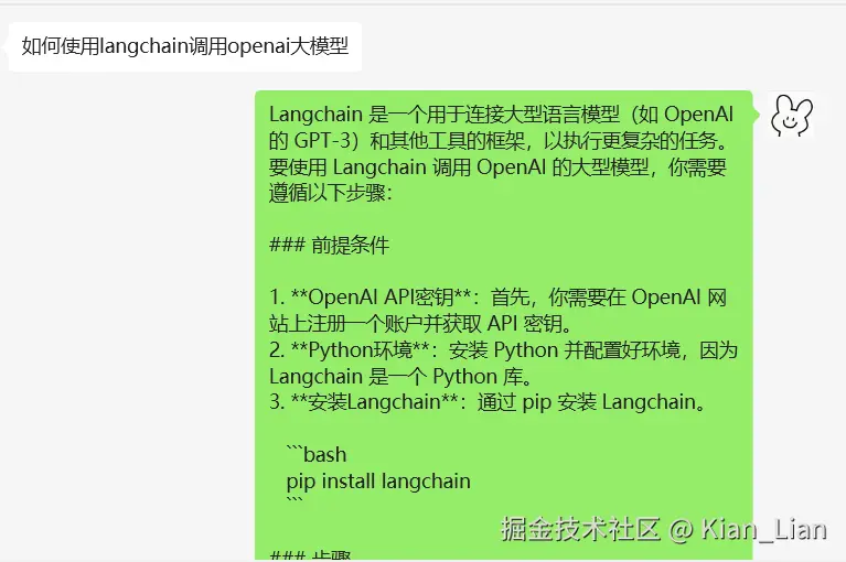 - 最后,我们简单构建了一个微信聊天机器人的案例。该案例通过 langchain 调用 AI 大模型来实现聊天的智能回复,并且添加了上下文记忆功能,以此提供更为出色的聊天体验