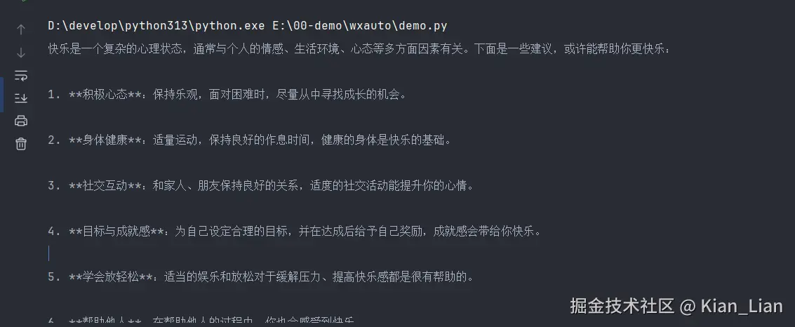 listen_list为需要监听的好友名称列表,然后我们通过循环给每一个好友添加监听,当有列表中有好友发送消息时就会触发然后获取消息内容,在判断是不是好友发送的消息,如果是好友发送的消息则调用AI大模型,获取大模型返回的答案,发送给当前的好友