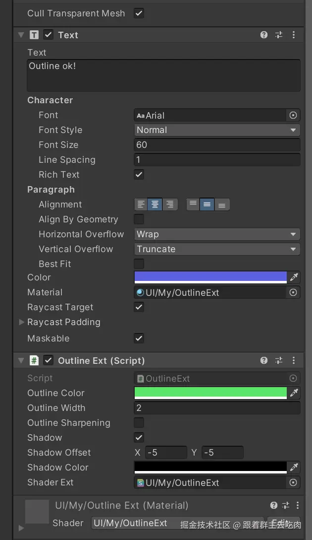 Shader 代码也是比较简短,关键的地方也有注释。需要注意的时,因为描边与阴影可以同时存在,所以在frag阶段要分开着色,它们的区分点是UV2从C#传过来的-1值。描边锐化的操作,实际上是将alpha值去除头尾。