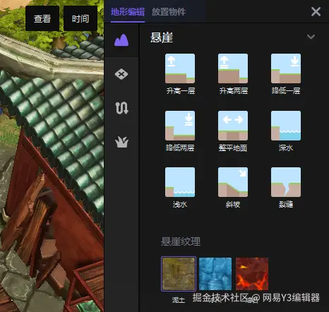 工具面板窗口包含两个选项卡:编辑地形和放置物件。这两个选项卡提供了构建有趣玩家体验的基本工具和对象。