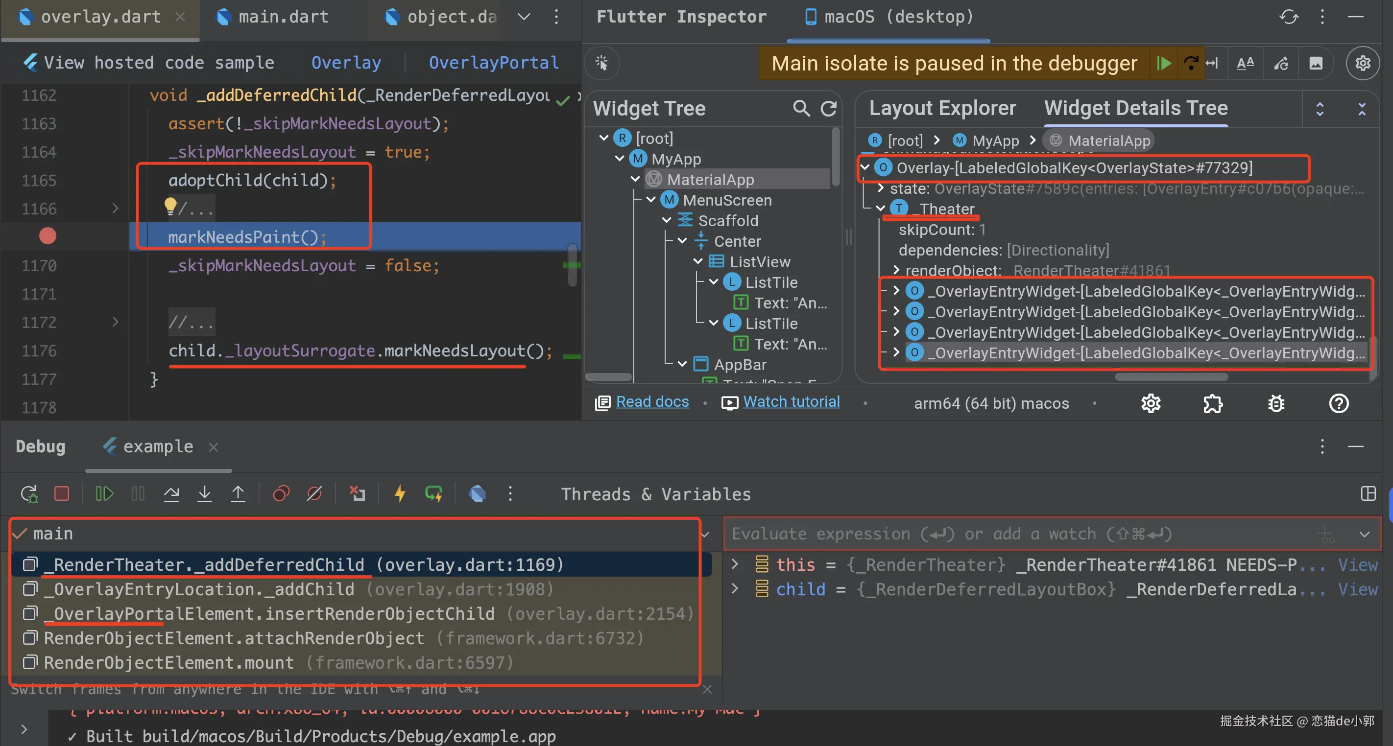 再稍微捋一捋,大概就是: OverlayPortal#overlayChildBuilder 的最终布局和绘制,其实都是通过 Overlay 的内部统一的 _Theater(剧院)完成,所以它在这个层面上其实和 OverlayEntry 相似,只是 Overlay 是通过 slot 等方式 “间接” 参与,本身它还是存在于页面的 tree 下面。