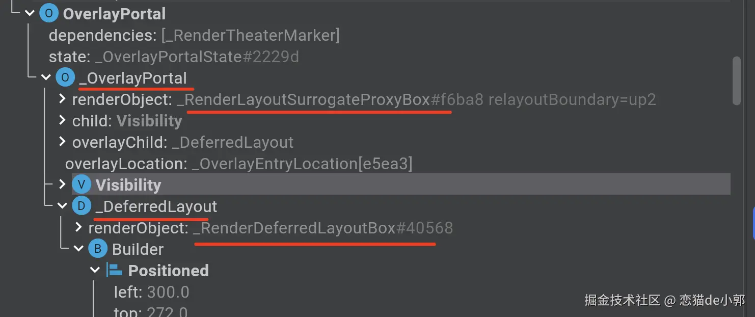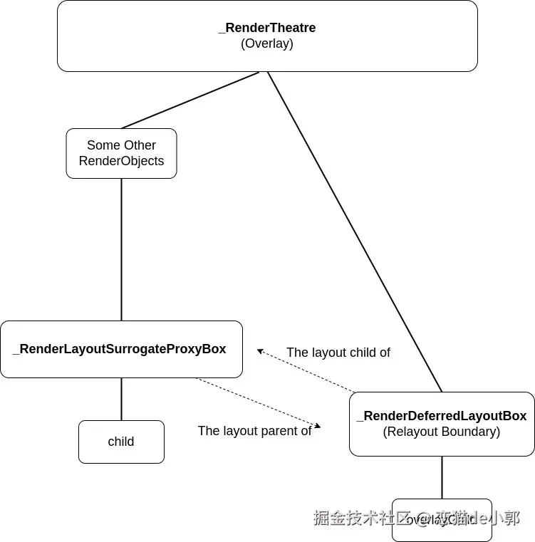 简单来说就是这样一张图,它通过 _RenderLayoutSurrogateProxyBox 存在页面 tree 里面,但是又通过 _RenderDeferredLayoutBox “布局和绘制” 在全局的 OverLay 里:
