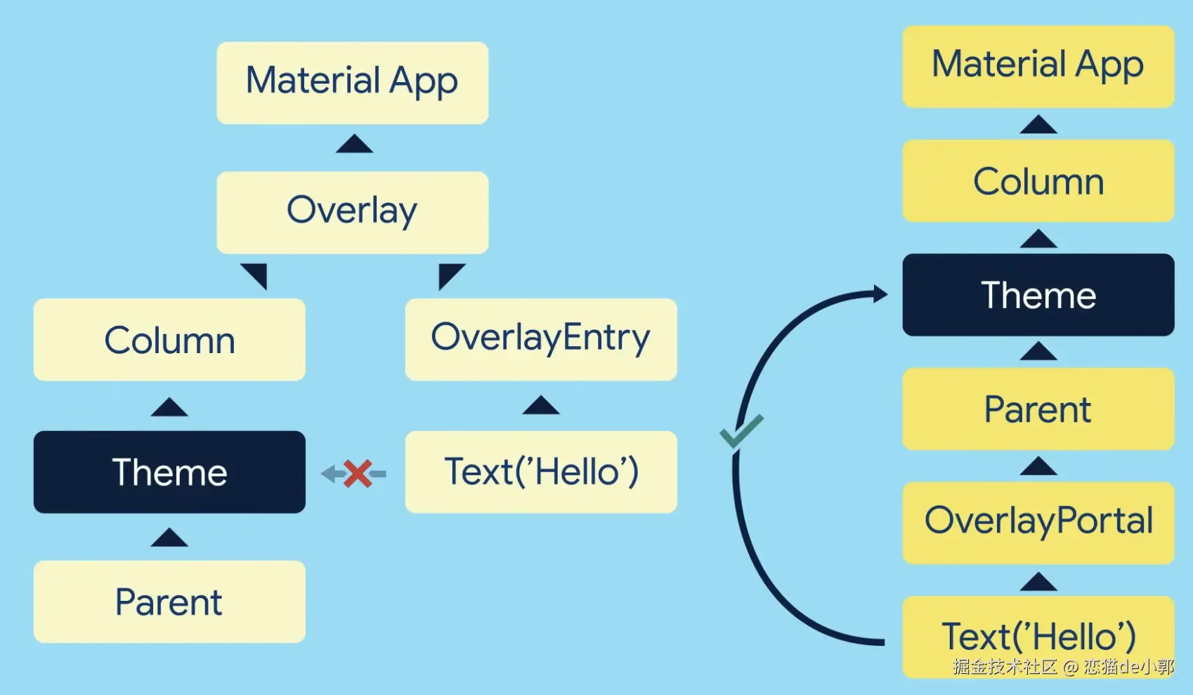 前面我们聊到,因为每个 OverlayEntry 在 Overlay 下都是平级且“互不影响”,所以当你在页面 A 内唤起一个 新的 OverlayEntry B , 那么 A 是没办法直接通过 InheritedWidget 共享各种状态,因为新的 OverlayEntry B 不属于页面 A ,而是互为平级的 OverlayEntry ,例如下方 Text('Hello') 无法共享“隔壁”的 Theme 。