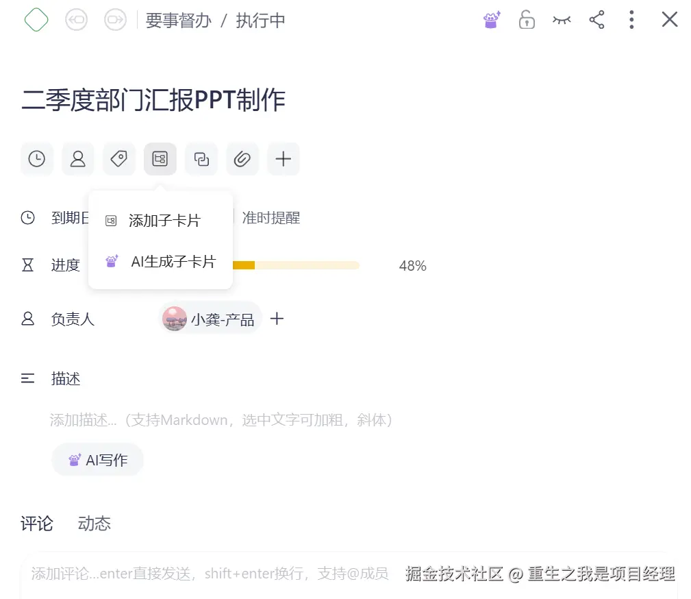 1) AI生成任务清单:板栗看板自带的AI生成任务清单功能,能根据项目需求和目标,自动生成任务清单和优先级建议。项目经理可以根据AI的分析和推荐,快速制定出精准的任务分配方案,提高团队的执行效率。