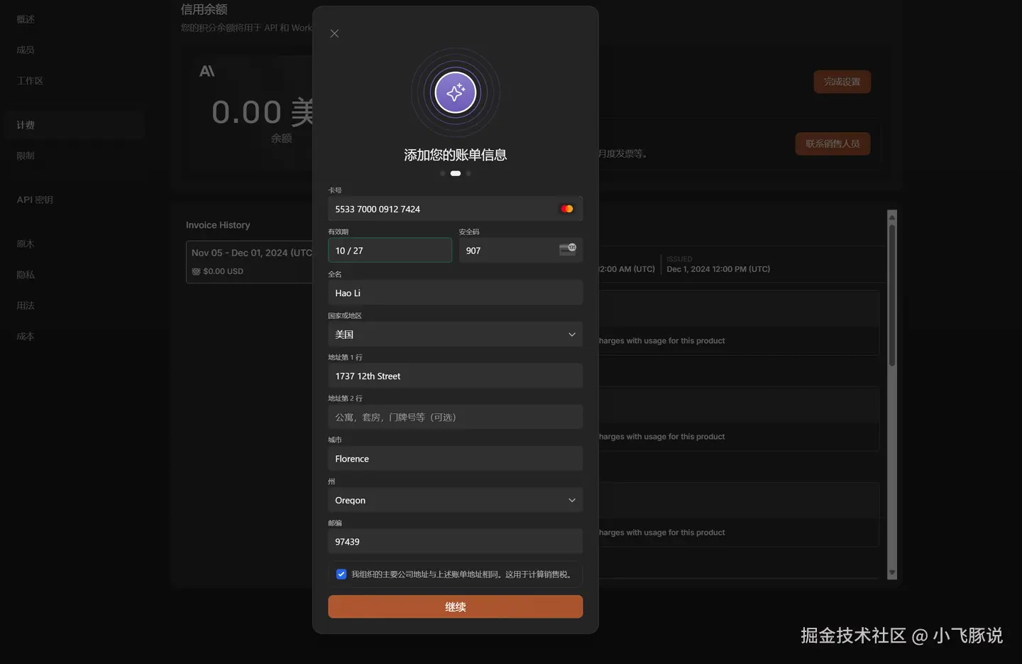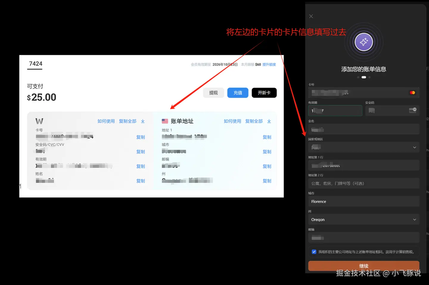 6.我这里使用的是wildcard的支付卡片。就以wildcard支付卡片为例,将信用卡上的信息准确的填写上去。在文末,放了wildcard的获取流程,大家可以自取。