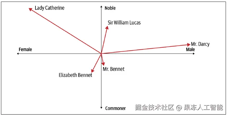 从图中我们可以推测出每个人物的相当多的信息。三个人是男性。达西先生非常富有,但他的贵族身份不明确(他被称为“先生”,而不是像威廉·卢卡斯爵士那样的贵族称号)。另一位“先生”本内特先生显然不是贵族,且经济困难。本内特先生的女儿伊丽莎白与他类似,但性别不同。示例中的另一位女性角色凯瑟琳夫人是贵族,且非常富有。达西先生与伊丽莎白之间的爱情造成了紧张关系——偏见来自向量中贵族方向对非贵族的偏见。