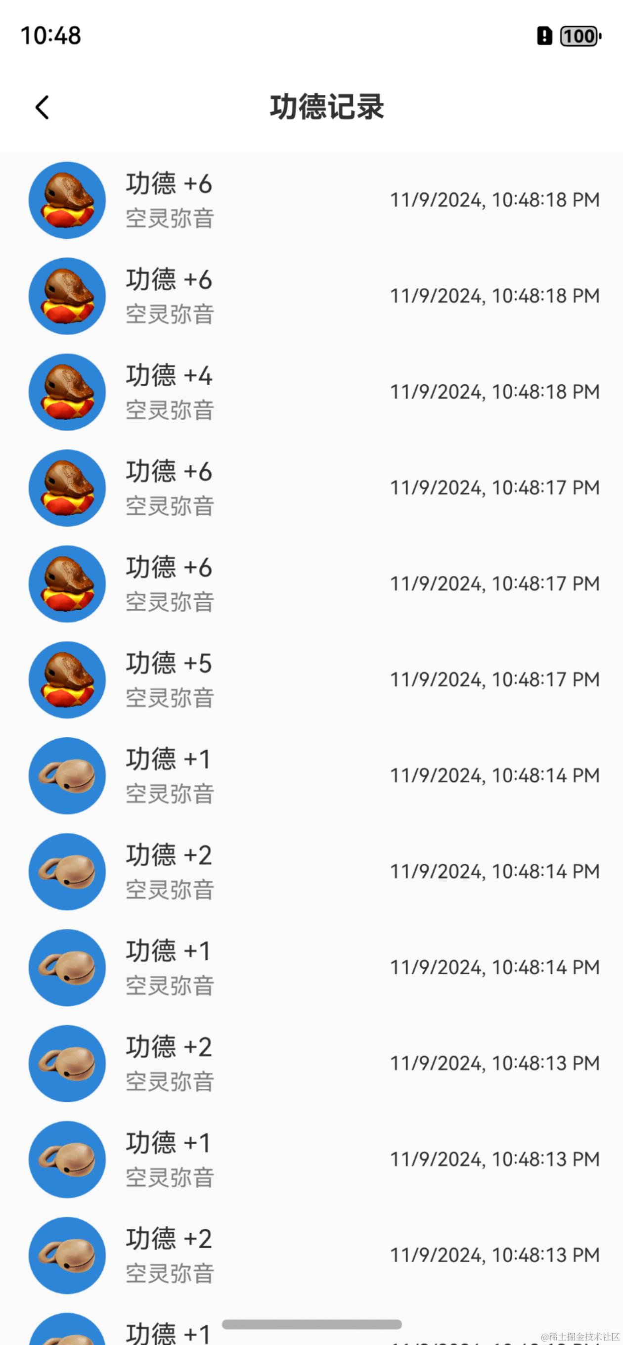 效果如下,点击左上角按钮,跳转到功德记录的面板。功德记录界面是一个可以滑动的列表,每个条目展示当前功德的 木鱼图片、音效名称、时间、功德数 信息。在这个需求中,我们还能了解鸿蒙开发中到如何跳转到新界面: