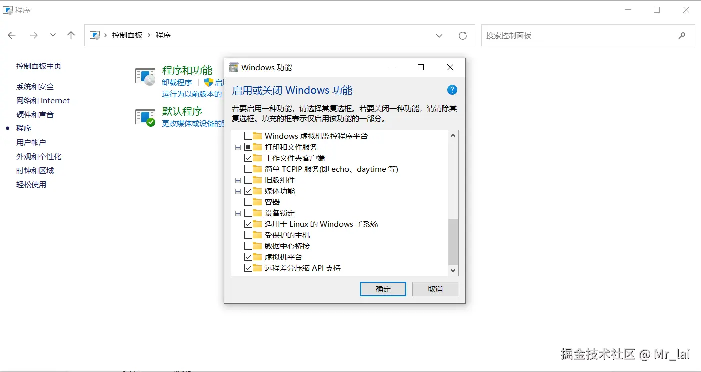 - 在弹出的windows 功能框中选择 “适用于 Linux 的 Windows 子系统”,