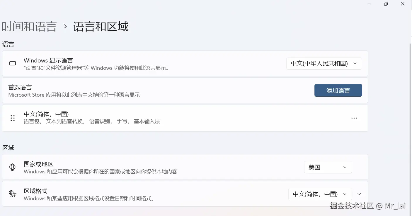- 由于WSA目前未在中国开放,首先需要更换电脑区域信息:设置-》时间和语言
