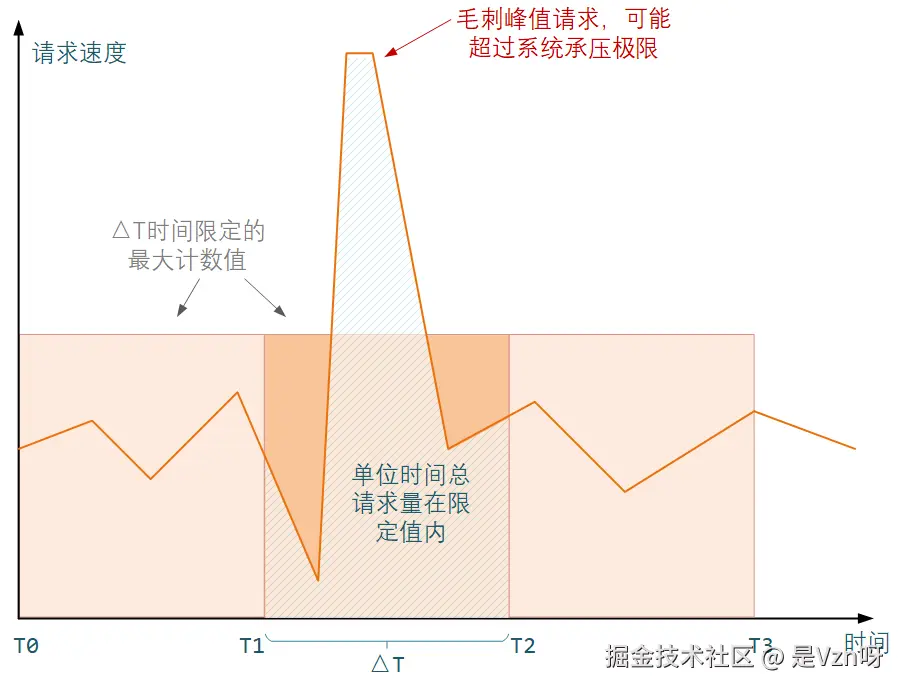 还有一种简陋的基于计数器的“伪限速”方案,这一思想很简单,每个计数周期维护一个计数器,然后来一个请求计数器就累加1次,计数满阈值后便拒绝后续请求,直到下一周计数器重新计数。这种本质上只能控制流量、无法控制过程流速,极端情况下的一些请求峰值,极有可能会击垮系统,要尽可能将流控计数周期设置的短一些,尽量避免在核心重要系统中使用此方案。