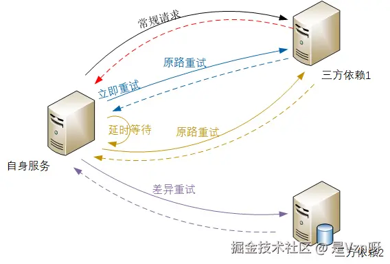 - 某次对外网络请求的时候,因为网络抖动等原因导致的请求失败,或者是请求处理超时,可以通过有限次数的重试,来提升对外交互处理的成功率