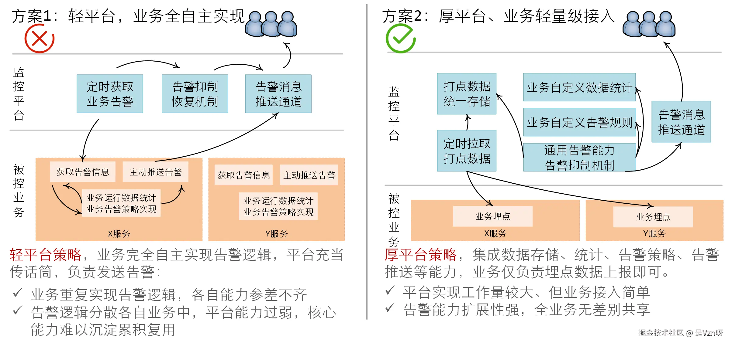 监控告警是开发与运维人员知晓线上系统异常状态的一个重要手段,实施的时候需要注意不要滥用告警通道。告警消息的发送最好支持分组聚合、消息抑制等能力,避免出现无用告警消息的狂轰滥炸,麻痹接收人员的神经、淹没真正重要的“求救”信号。同时,在构建监控告警平台的时候,考虑尽量独立于业务,让告警相关的逻辑从业务中解耦,降低监控对业务逻辑的侵蚀性。