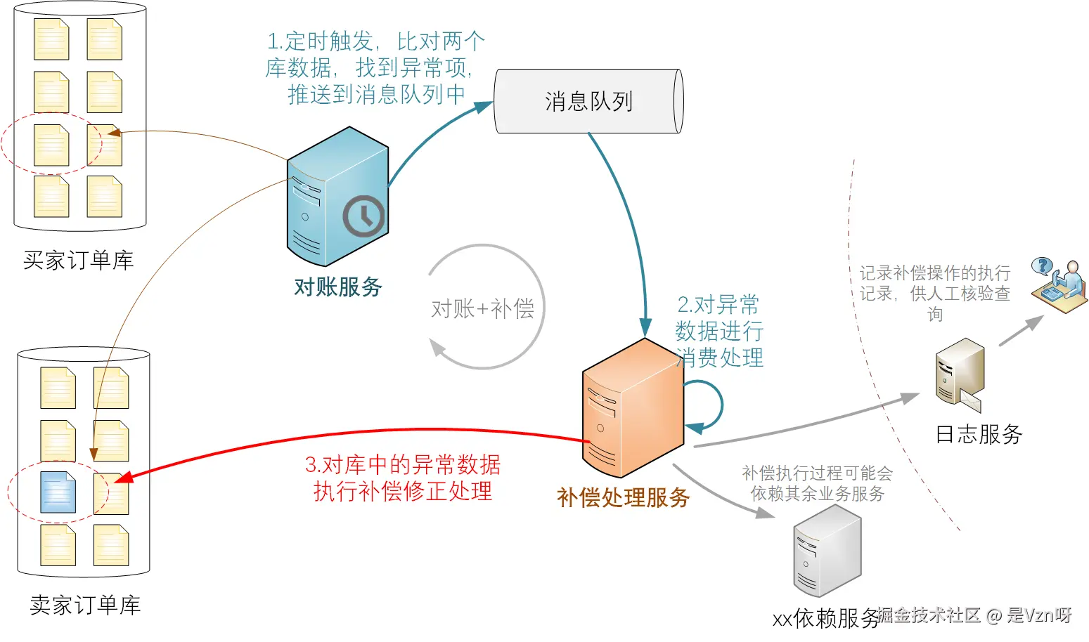 补偿机制经常被使用在分布式系统中,它的一个核心前提是,允许并接受过程中的暂时性数据问题,并通过补偿措施,保证最终的数据一致性。那么,如何知晓是否需要执行补偿操作、哪些数据需要执行补偿操作呢?这就需要“对账”了。