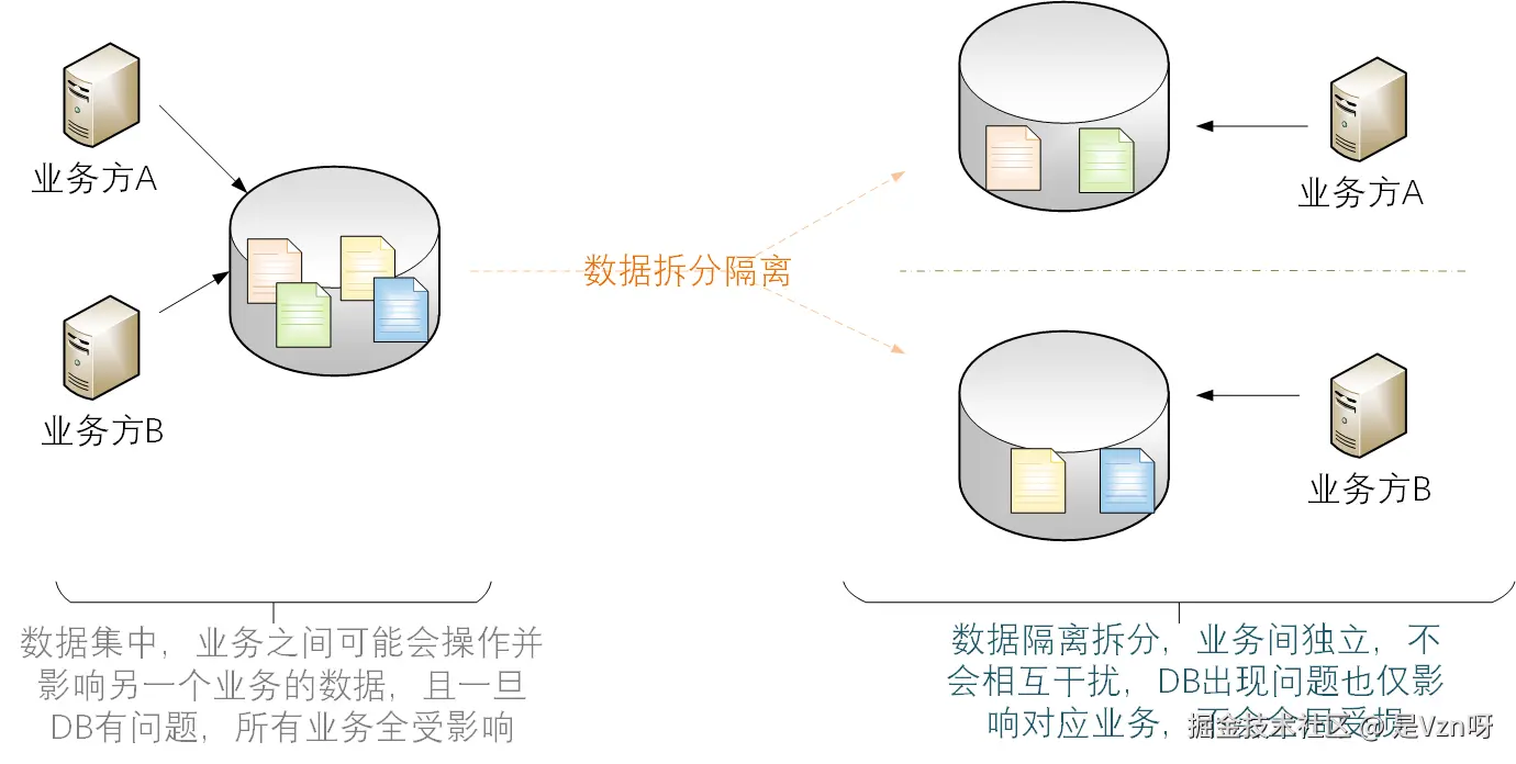 最直观的表现,就是分库分表了。比如对系统的数据,按照业务维度进行分库存储,或者按照业务的重要度进行识别,将数据识别为重点数据/非重点数据,亦或是保密数据/非保密数据,然后按照细分后的结果实施差异化的数据存储保障策略。比如,对于非重点数据,简单的搞个一主一从双副本即可, 而重点数据,可能得考虑异地多副本可靠存储与备份。