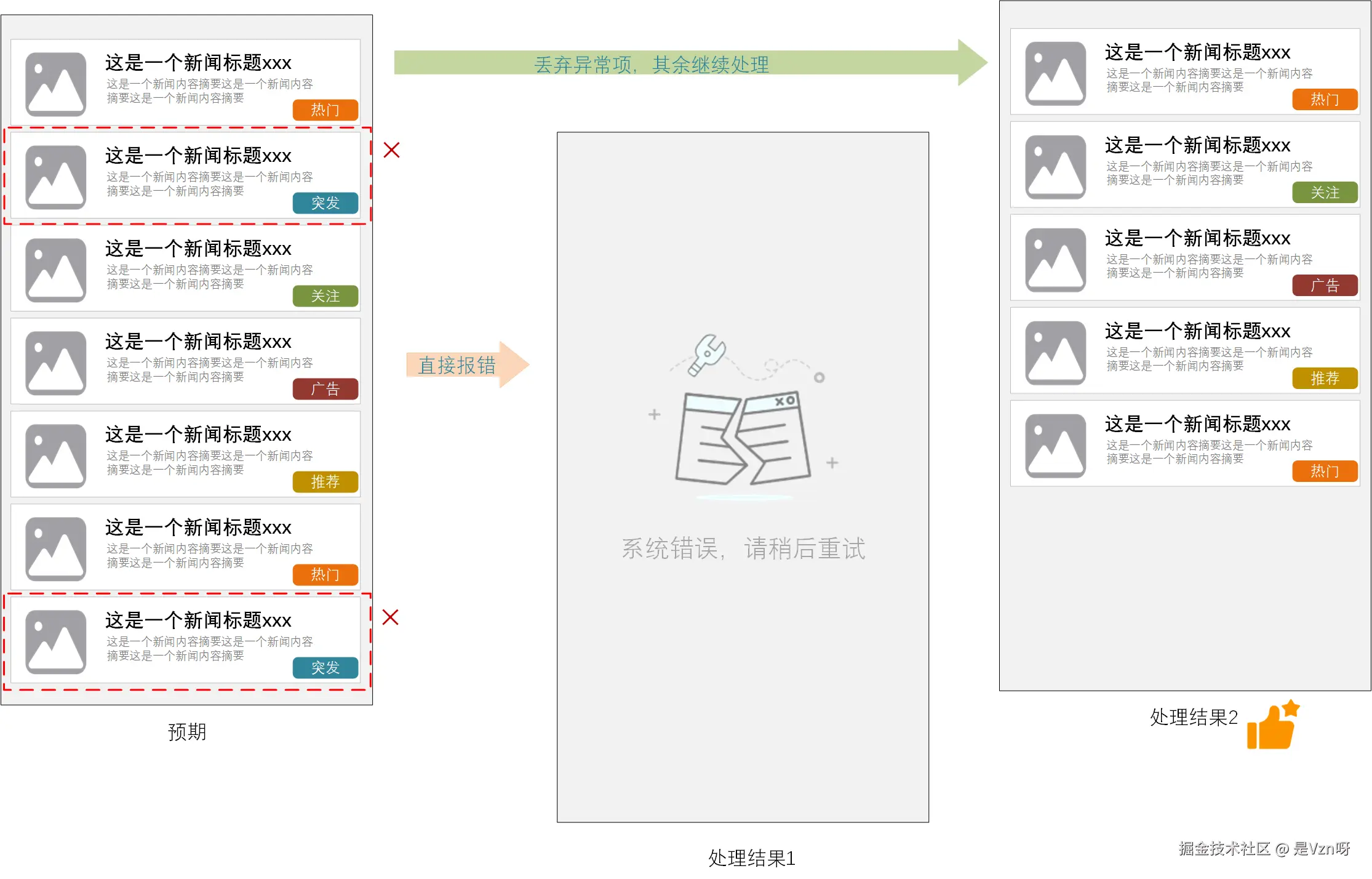最终多个来源的数据,会被混合成一个列表内容流展示给用户。这个过程中,如果其中某一路(比如:即时突发新闻)出现异常未获取到数据,对用户而言其实是无感的,因为用户也不知道究竟是系统出问题了、还是确实没有即时突发新闻。但是因为某一路数据的获取失败,直接给用户报错异常、或者给用户一个白屏显示,反而是将用户给放大了。