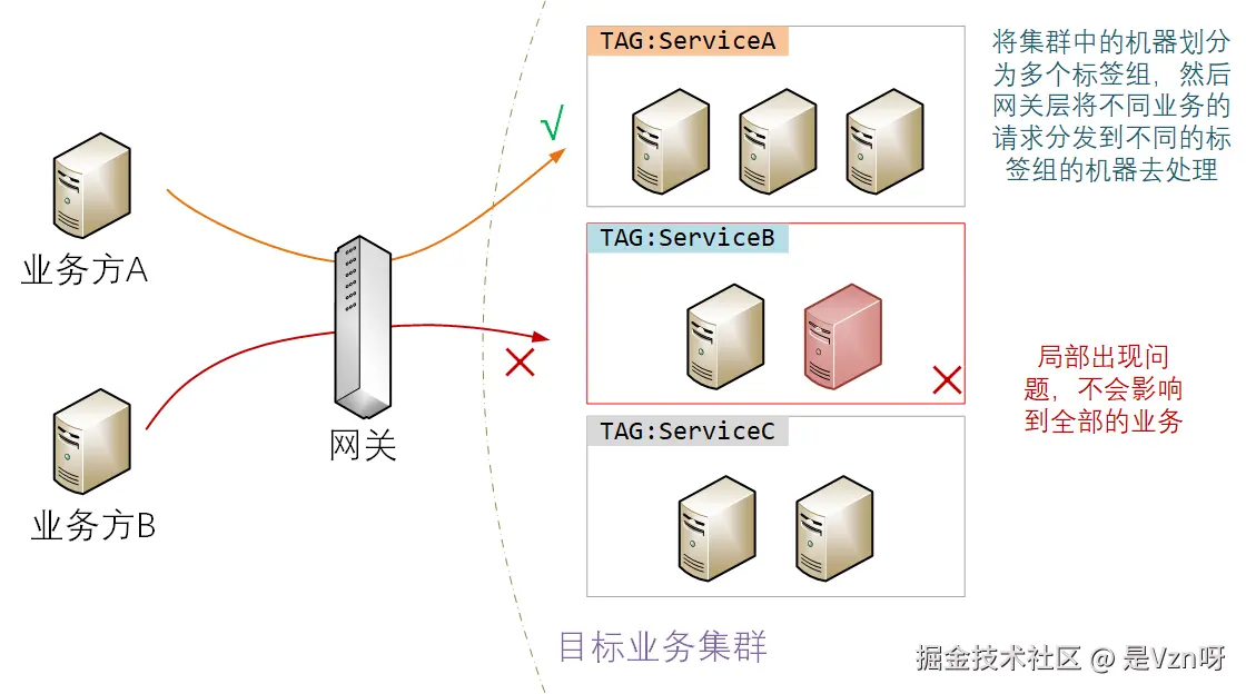 不同的业务使用不同的机器,从硬件资源层面进行隔离。通过将机器分组的方式,针对重点服务或者是高危服务实现专机专用,而对应一般普通服务,则可以多个业务混用同一套机器,从而实现了差异化的隔离处置。