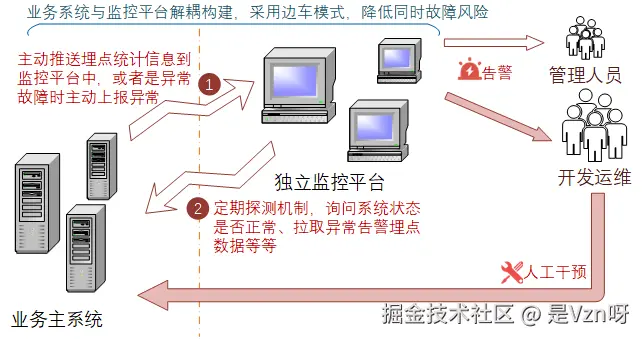前面提及的容错设计以及一些灾备方案,其面向的是故障已经发生的情况下,如何去应对故障来保障系统业务的可用性。而更为稳妥的一种预期,是能够在问题刚暴露一点苗头的时候,就能被发现并及时化解掉,这里就需要在系统实现的时候进行一些必要的数据埋点与指标采集监测,及时将系统的预警信息告知具体维护人员,提醒维护人员及早介入处理。