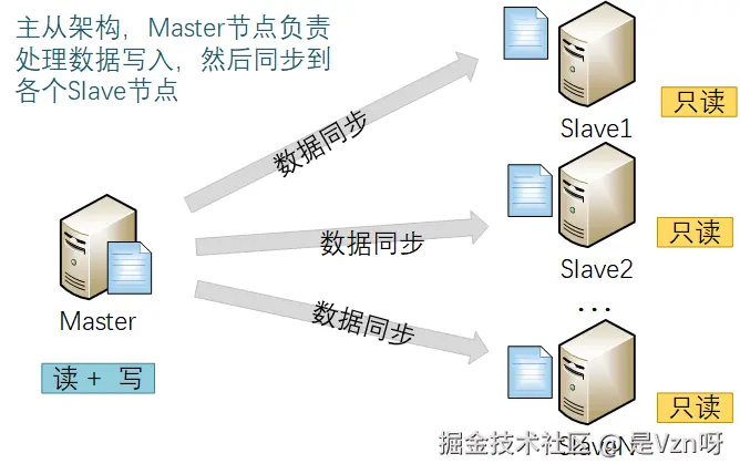 最常见且最简单的多副本策略,就是Master-Slave这种架构,类似MySQL的一主多从架构。在这种架构中,通常由Master节点负责数据的写操作,然后通过内在的数据同步机制,将数据变更同步更新到各个Slave节点进行数据的多副本存储。为了提升硬件的利用率,Slave节点除了用于数据内容的多副本可靠存储,还可以对外提供只读查询操作,在必要场景下支撑业务的读写分离诉求。