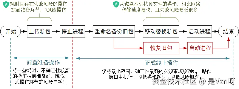 结合上述操作可能存在的风险点,改良版的做法,自然就是旧包不删、改为重命名备份起来,这样新包万一有问题,可以直接用旧包回滚恢复线上服务即可。