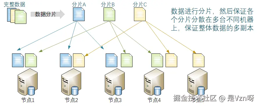 - 分片存储形态1:分散在不同机器上存储