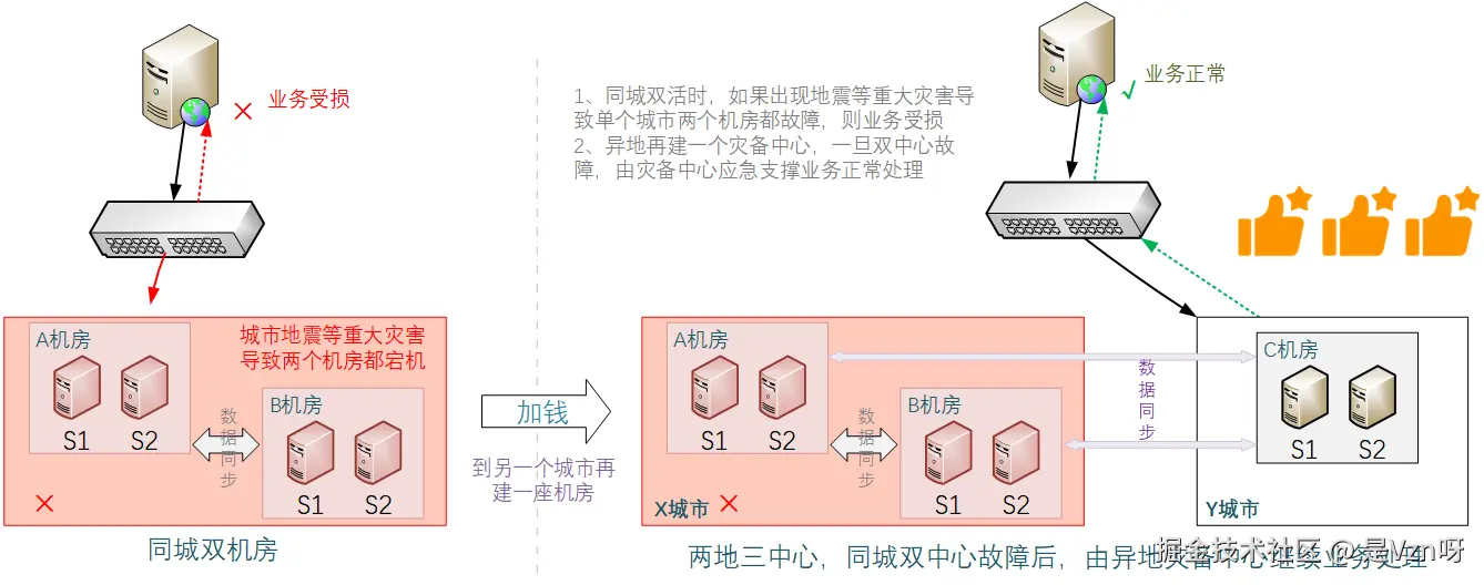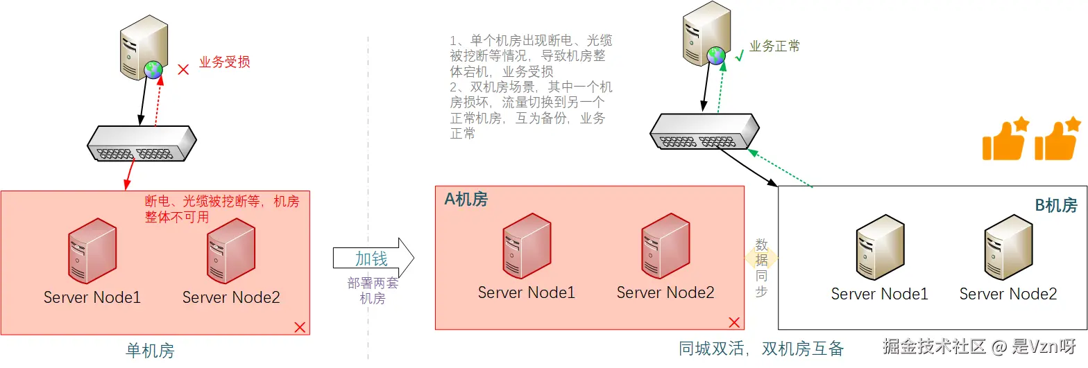 上述在同一机房内利用多个节点组成集群的方式,虽然能应对单台机器的故障场景,但如果机房出现整体故障,比如停电、着火、光缆被挖断等情况,依旧会导致全军覆没。为了应对这一可能的风险,自然而然的解决方案就是再建一个机房,这样两个机房互为备份,风险就大大降低了。通常而言,两套机房之间会涉及到数据的同步,所以对机房之间的网络传输速度与时延有极高要求,这就要求两个机房不能离得太远,最好在同一个城市。 —— 这便形成了常说的同城双活架构。