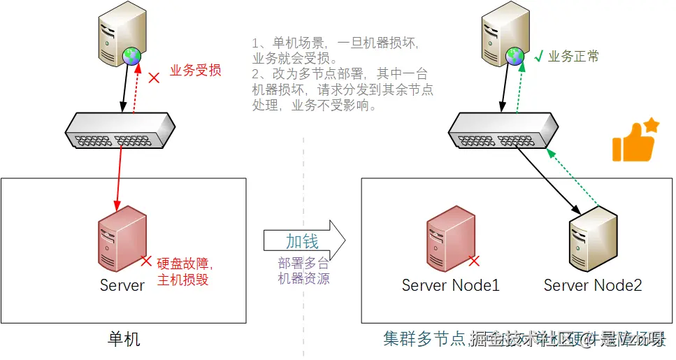 为了应对单台服务器硬件的损坏、比如硬盘损坏、电源烧毁等, 单个机房内部署多个节点,由多个不同的机器,共同组成一个集群,这样其中一个节点故障,其余节点依旧可以正常处理业务,有效避免了单点故障的出现概率,提升了业务的可靠性。